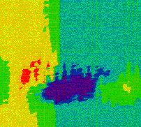 光はディスクプローブの測定の様子,右はプローブが読みとった金属針先端の様子(2ミクロン角).青い部分が先端で,左の赤い部分は針によって光が散乱されている様子を表している.