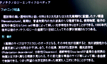 2001年7月にお台場のフジテレビの近くにオープンした日本未来科学館.毛利衛さんが館長を務め,IT,ナノテクノロジー,生命,宇宙と環境という21世紀に最も重要と考えられる4つの科学技術をまとめた最新の博物館となっている.そのうち,ナノテクノロジーには量子技術や超伝導,マイクロマシーンなどが採り上げられているが,フォトニック結晶も加えられており,本研究室の成果がその代表として常設展示されている.